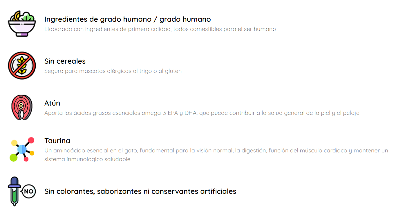 Atún: Proporciona los ácidos grasos esenciales omega-3 EPA y DHA, que pueden contribuir a la salud general de la piel y el pelaje.